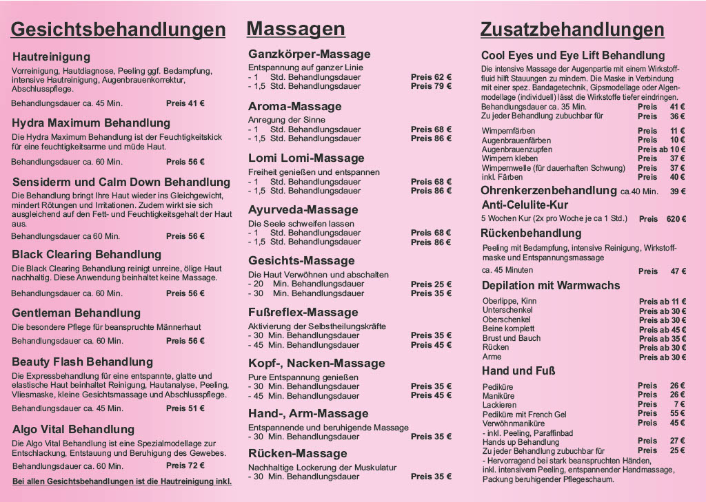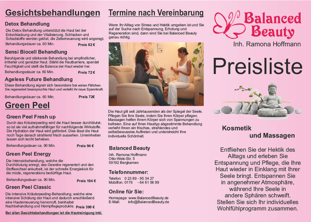 Die aktuelle Preisliste von Ihrem Wellnessstudio Balanced Beauty in Bergkamen.